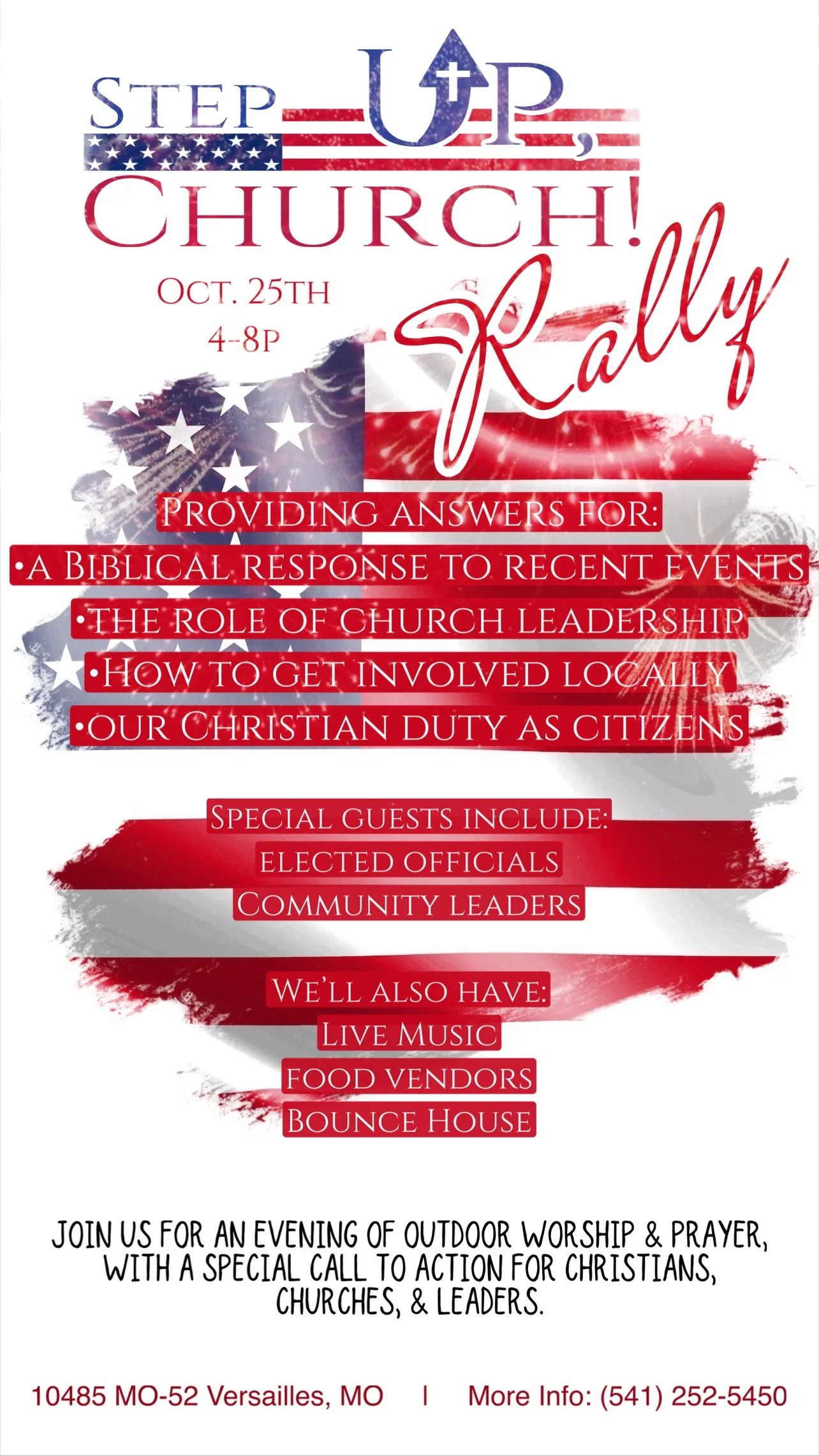 The grounds will open at 4:00 PM on Saturday, October 25th with food, popcorn, snow cones, bounce houses, and fellowship for families and guests. The main event will begin at 6:00 PM with live music from local worship leaders, followed by several speakers addressing the serious issues facing our communities, our state, and our nation. The evening will also include public prayer, seeking God’s direction and courage to step up in faith and action.